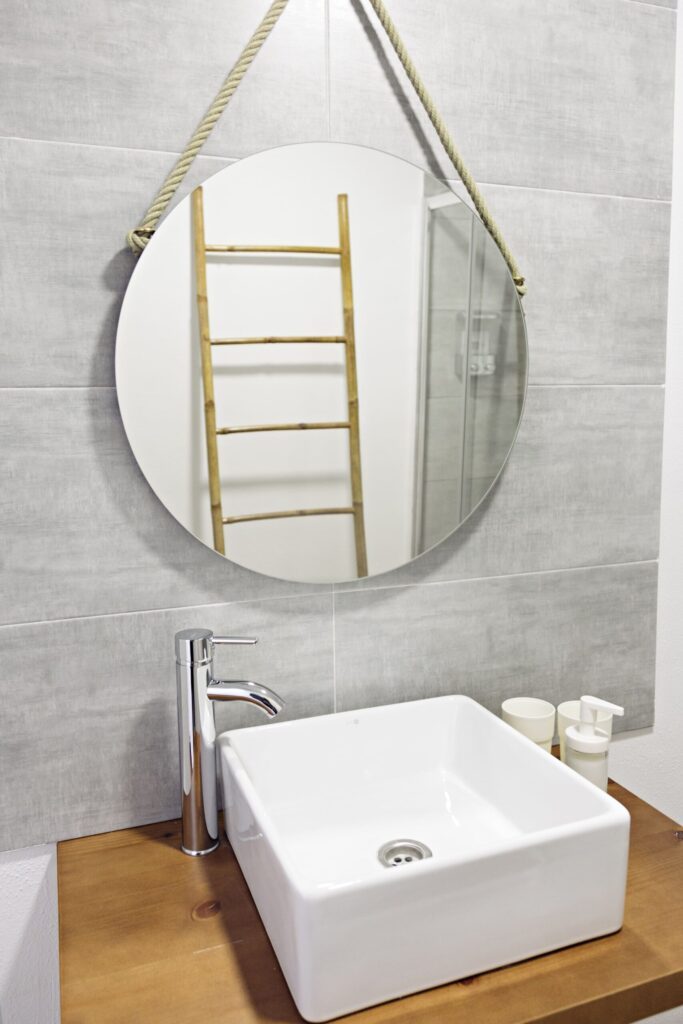 The bathroom is inside the room. Minimalist decoration in grey, white and wood, it has a shower, hairdryer and basic toiletries.